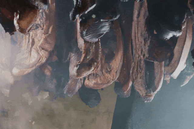 将腊肉悬挂在棚子内的柴火堆上方熏制