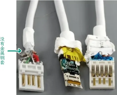 充电时需要频繁插拔充电头,这个过程就造成插头和接口的位置被反复弯折,一些劣质的充电线偷工减料,没有在接口处使用金属钢套,线材赤裸裸地接触接口,很容易被扯断。