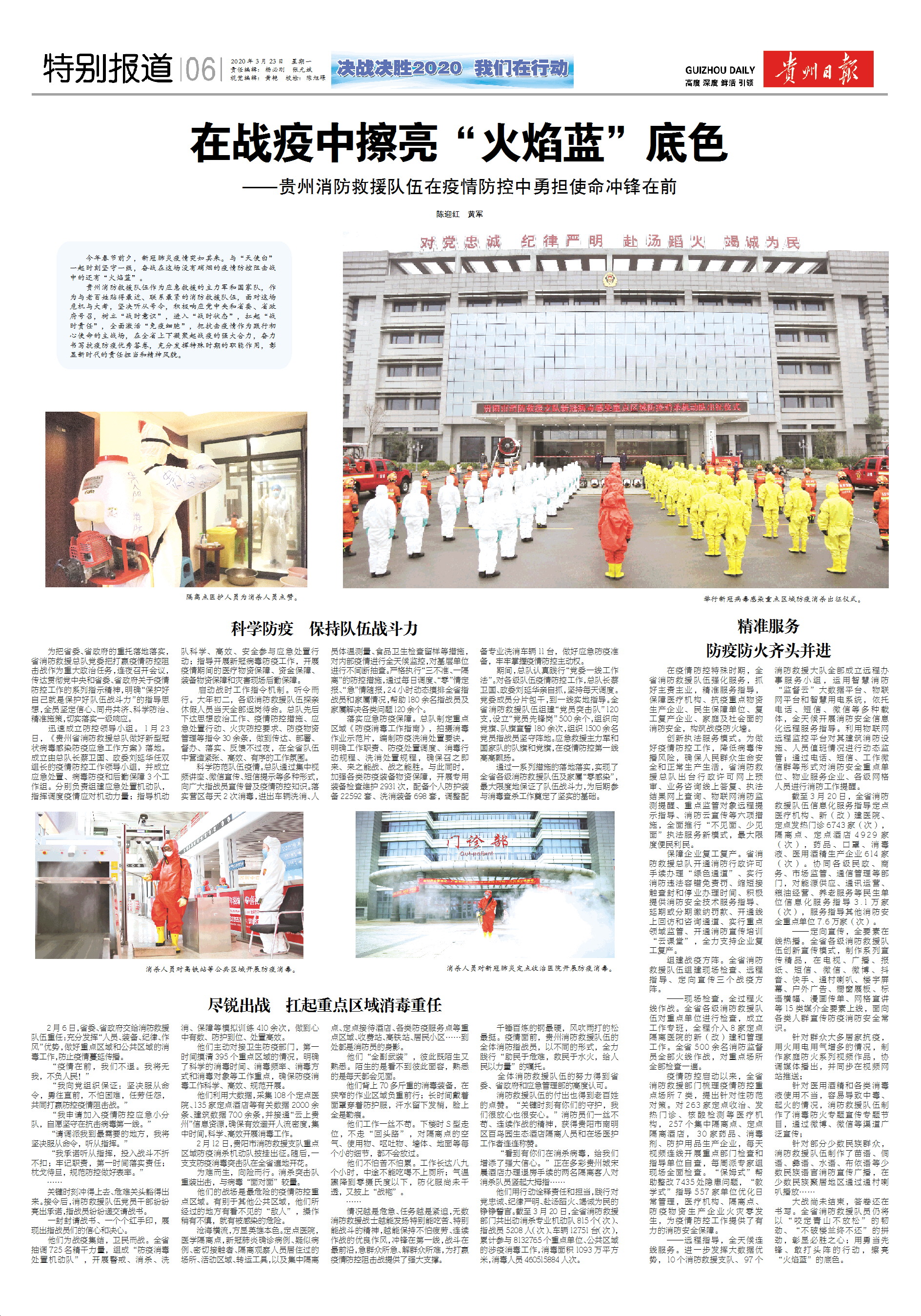 贵州消防救援队伍作为应急救援的主力军和国家队,作为与老百姓贴得最近、联系最紧的消防救援队伍,面对这场危机与大考,坚决听从号令,积极响应党中央和省委、省政府号召,树立“战时意识”,进入“战时状态”,扛起“战时责任”,全面激活“免疫细胞”,把抗击疫情作为践行初心使命的主战场,在全省上下凝聚起战疫的强大合力,奋力书写抗疫防疫优秀答卷,充分发挥特殊时期的职能作用,彰显新时代的责任担当和精神风貌。